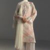 An embroidered aqua marine shirt with watercolor inspired print and schiffli embroidery, paired with a printed trouser, and finished with a sugar white dupatta for a dreamy, artistic ensemble.