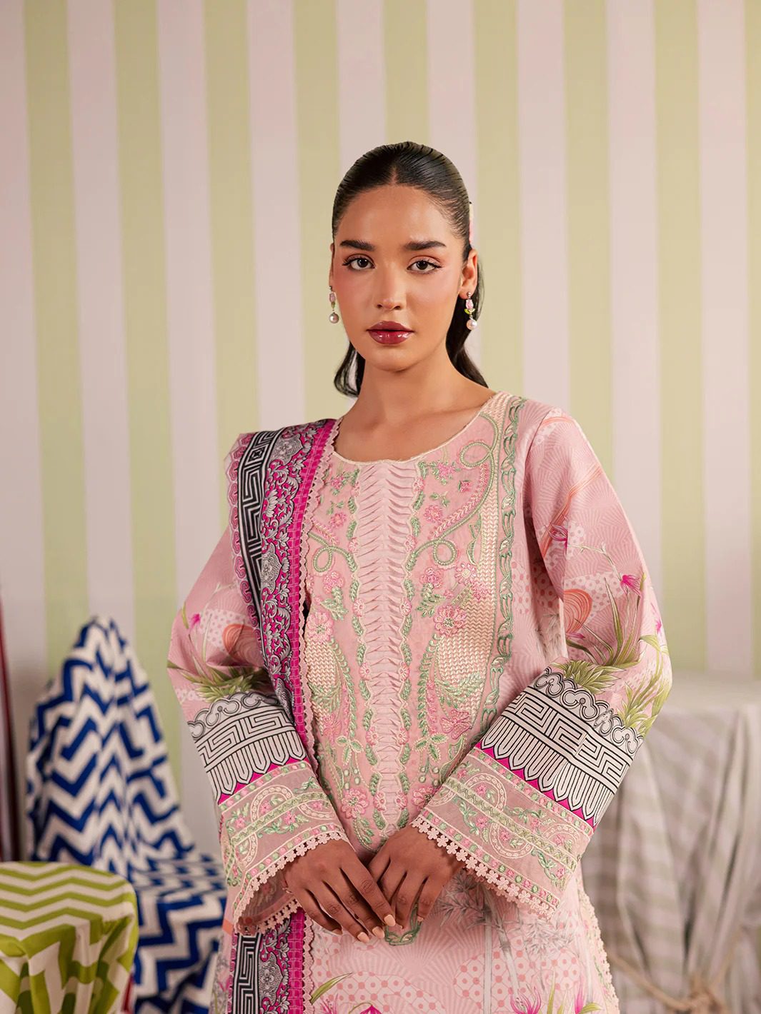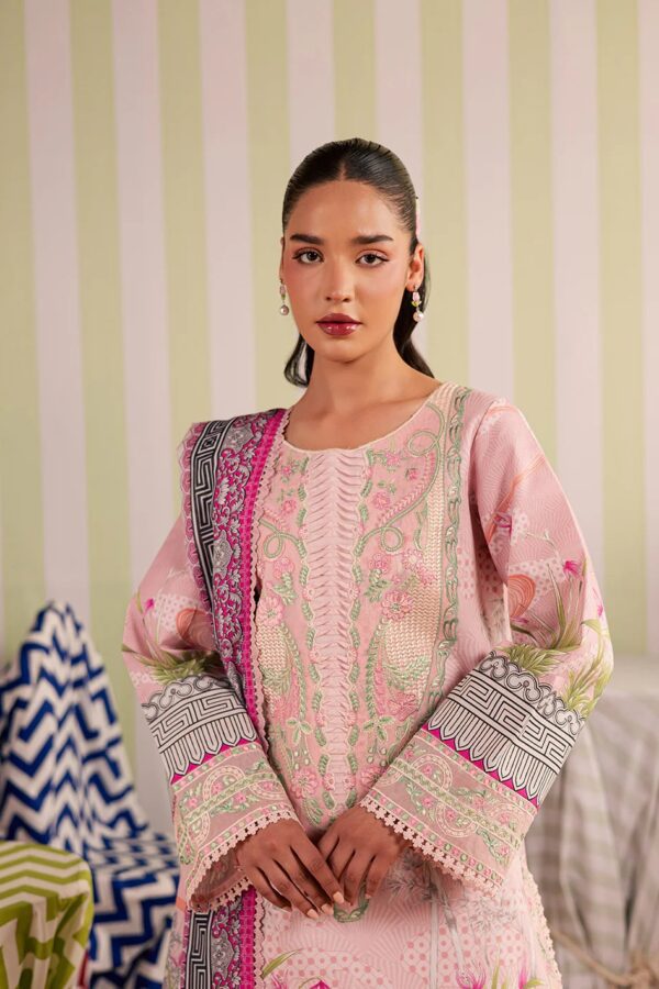 PRINTED LAWN SHIRT 03 MTR EMB NECKLINE 01 PCS EMB SIDE SLIT LACE 1.50 MTR EMB FRONT & SLEEVE BORDER 1.75 MTR