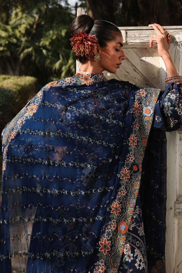 An etherial navy blue ensemble adorned with rich floral embroidery in orange white and blue hues exuding timeless elegance Beautifully complemented by a matching embroidery dupatta this look is finished with graceful sophistication The fluid silhouette and meticulous craftsmanship come together to create a statement of refined tradition with a modern edge.