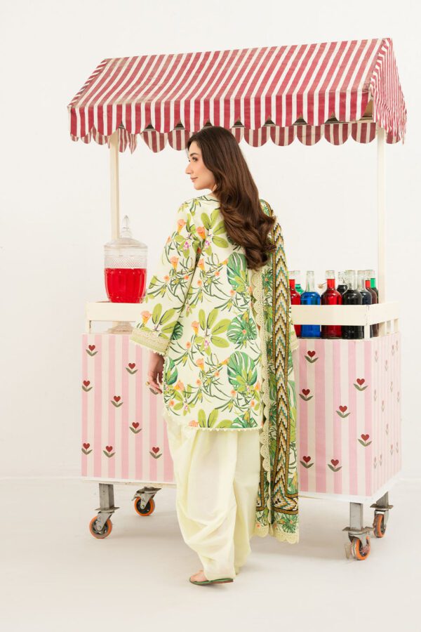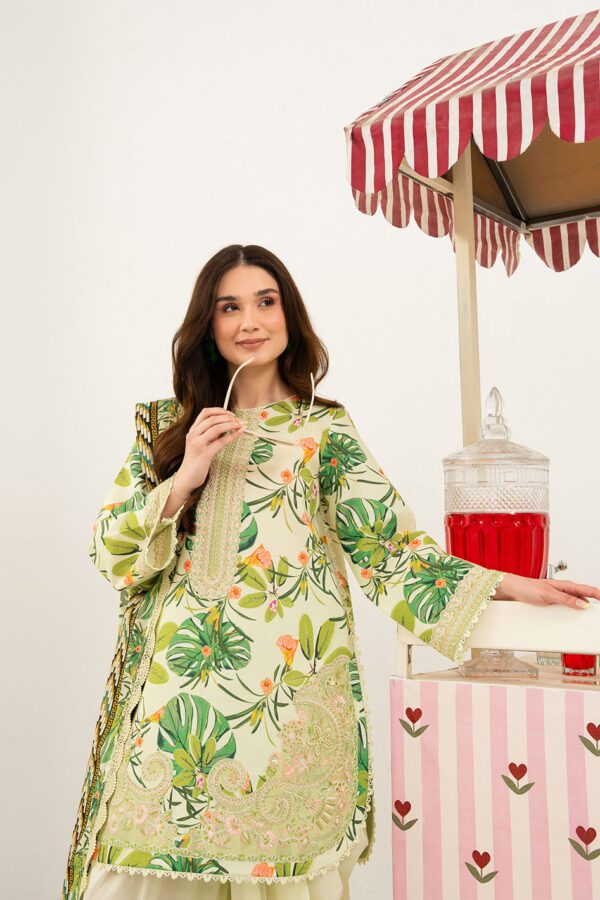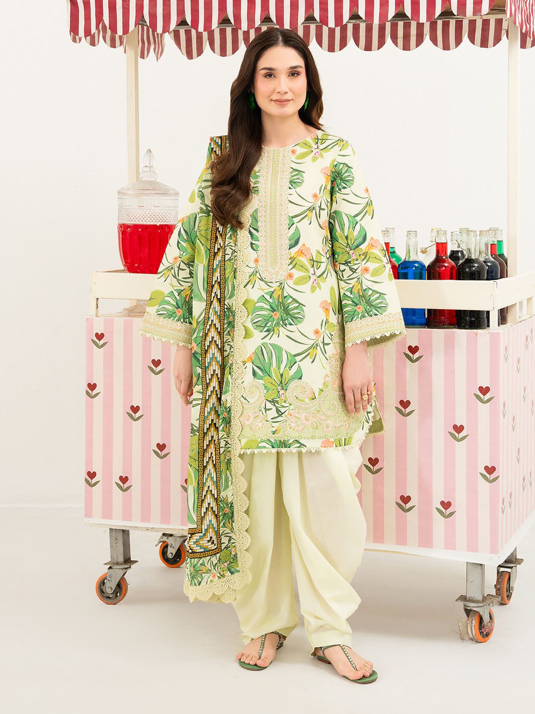 PRINT LAWN SHIRT 03 MTR EMB NECKLINE 01 PCS EMB DAMAN 01 PCS EMB SLEEVE BORDER 0.90 MTR