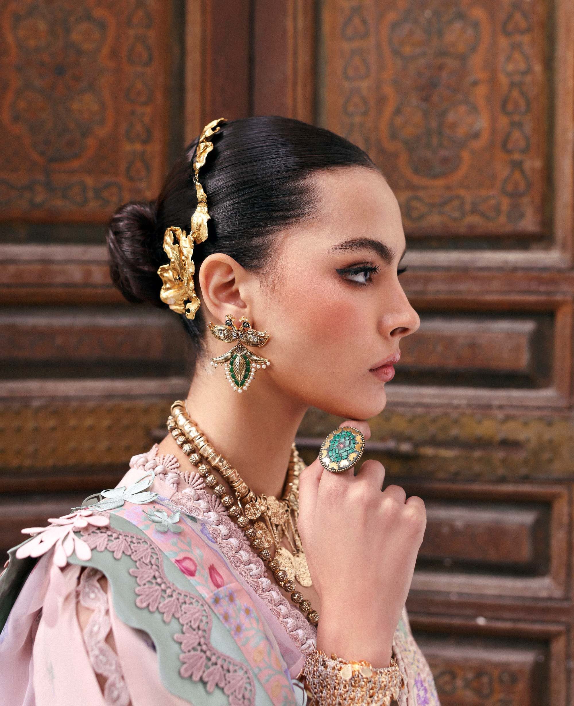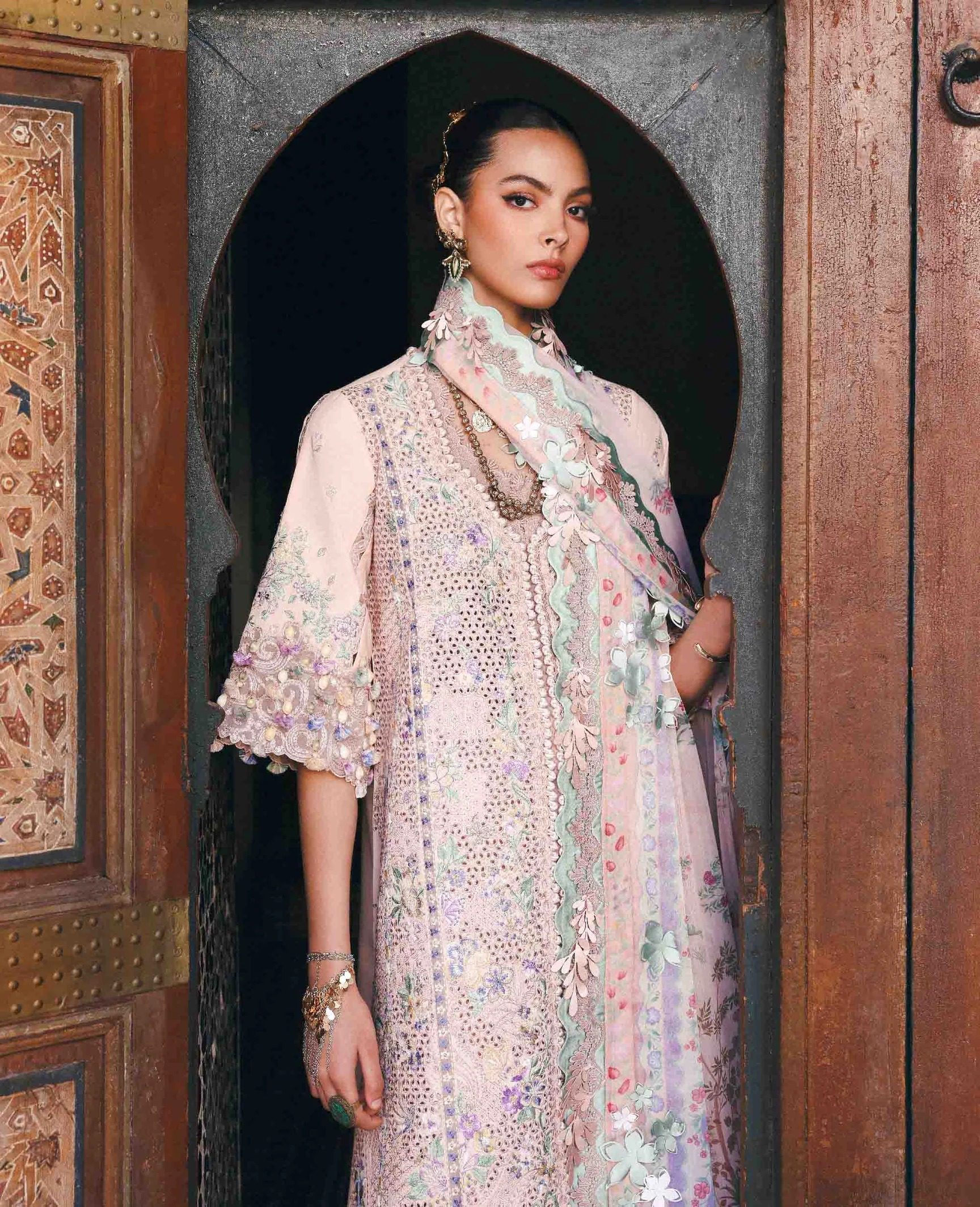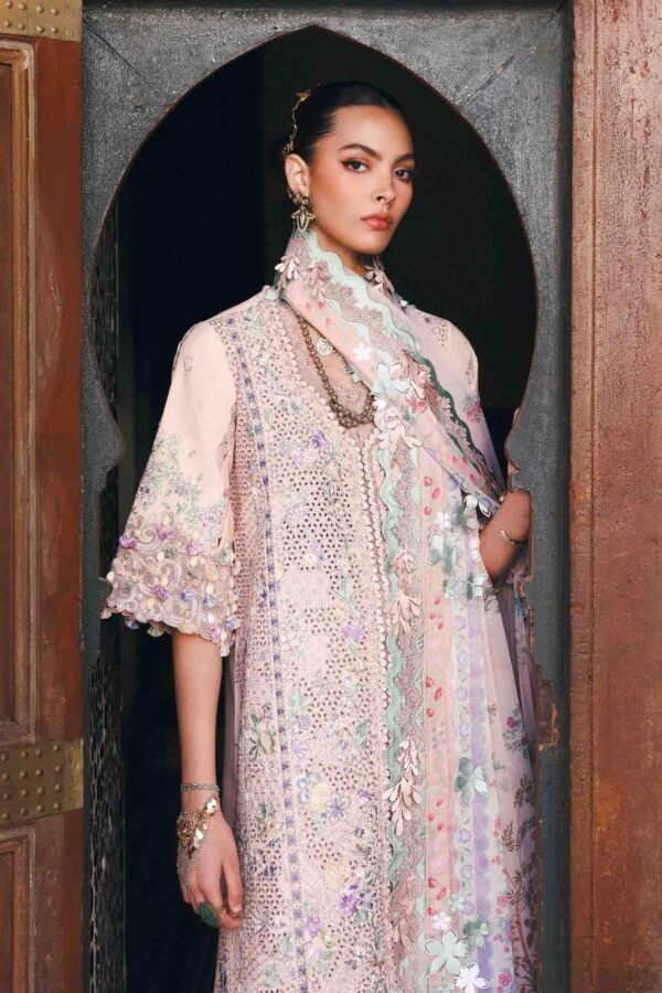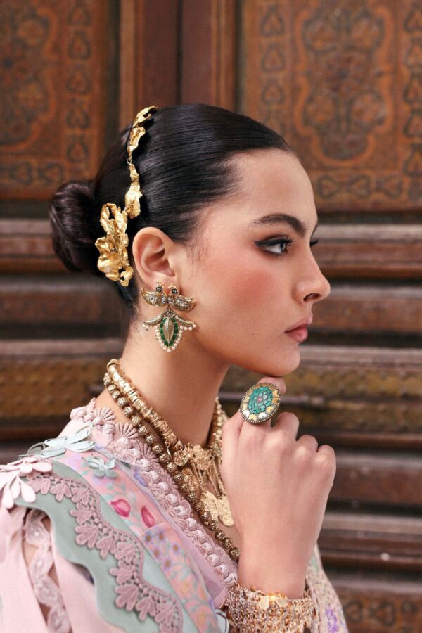 This front-open lawn shirt is fully embroidered with an all-over boring pattern, set on a luminous peach base that instantly feels festive. Soft tones of peach, verdant greens, lilacs, and hints of golden yellow come together in delicate floral motifs, creating a look that’s rich yet beautifully balanced. The sleeves are thoughtfully composed and finished with a patterned organza border, while the hem is detailed with finely crafted organza, enriched with elegant patterns and floral artistry. A timeless Eid ensemble that is graceful and made to shine through every gathering.