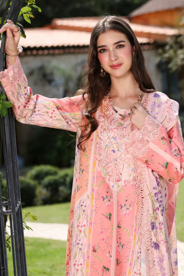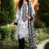Printed Satin Stripe Lawn Shirt 3 Meter Dyed Organza Embroidered Neck 01 Piece Dyed Organza Embroidered Front Border 30 Inches Dyed Organza Embroidered Sleeve Border 40 Inches Printed Silk Dupatta 2.5 Meters Dyed Cotton Trouser 2.5 Meters