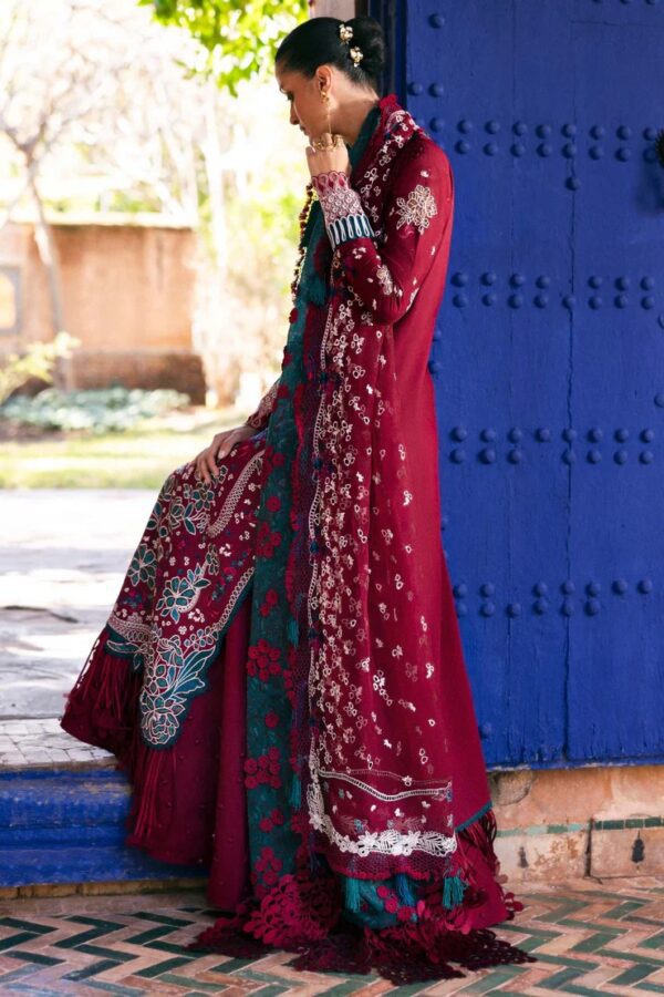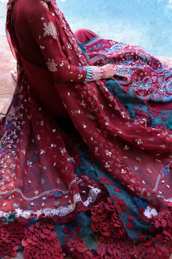 This three-panel maroon shirt showcases intricate laser-cut embroidery and tatami filling techniques, featuring bold florals and beautifully printed Saru tree motifs in shades of red, teal, and deep blue. Sleeves are adorned with delicate floral sprays, organza borders, and appliquéd patches that elevate the overall look. Completed with a maroon organza dupatta detailed with intricate eyelet work, elegant pallus, and a four-sided printed patti, this ensemble is refined, structured, and effortlessly festive. Cambric trousers tie the outfit together for a polished, day to-evening-ready look.