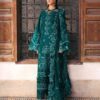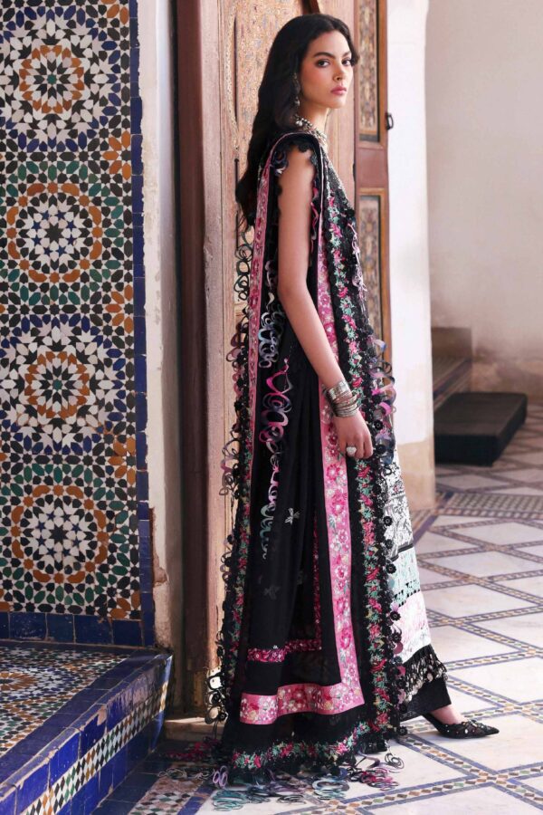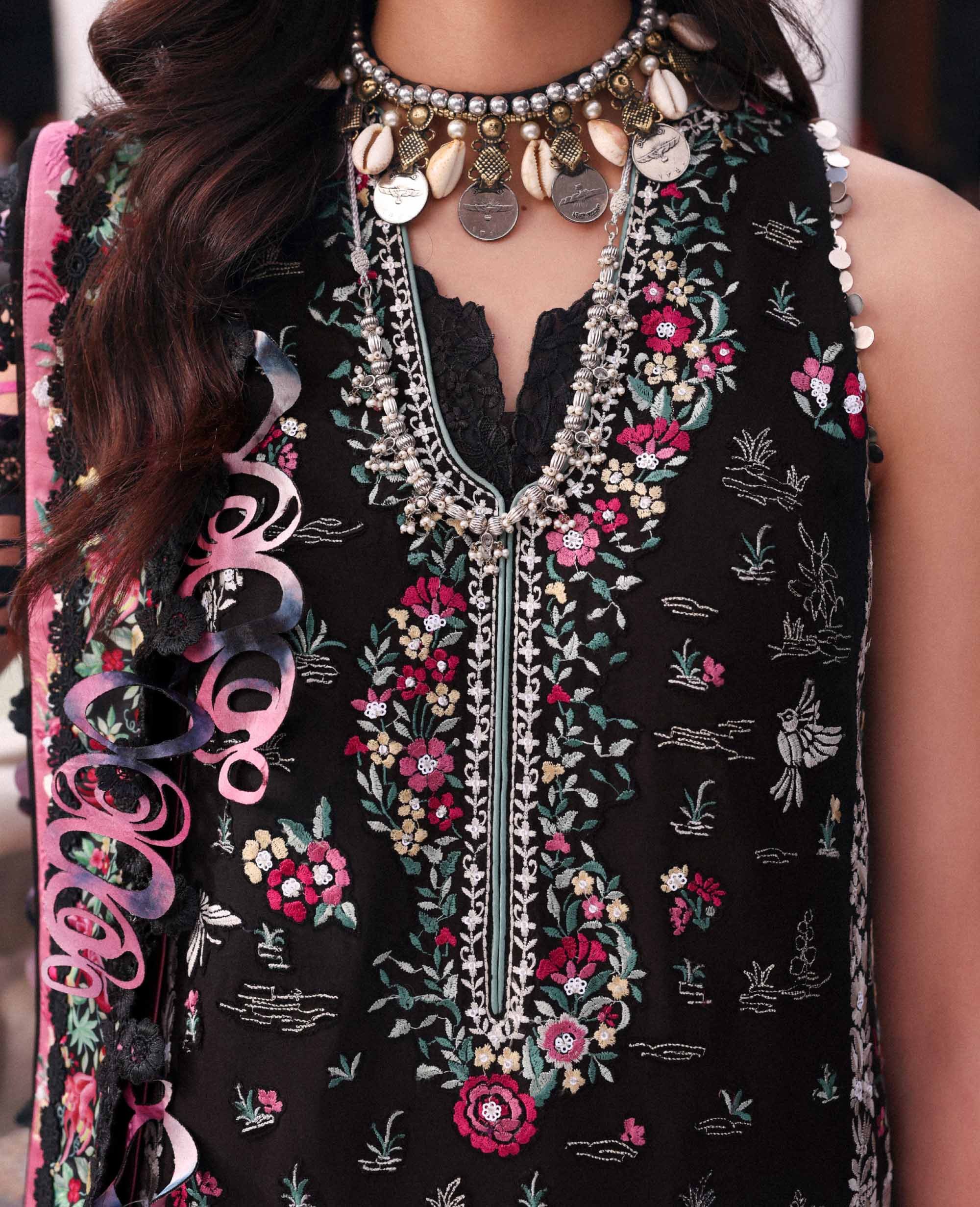 This three-panel black shirt is crafted with intricate Parsi Gara embroidery, showcasing classic floral and shikargah motifs in delicate shades of pink, green, and yellow, beautifully highlighted with crisp white accents. The silhouette is elevated with contrasting satin silk borders along the hem and back, enhanced with a graceful spray of embroidery. Floral-detailed sleeves finished with an organza hem border add a refined touch, while the chiffon dupatta adorned with four-sided embroidered and printed contrast pattis completes the ensemble with effortless sophistication.