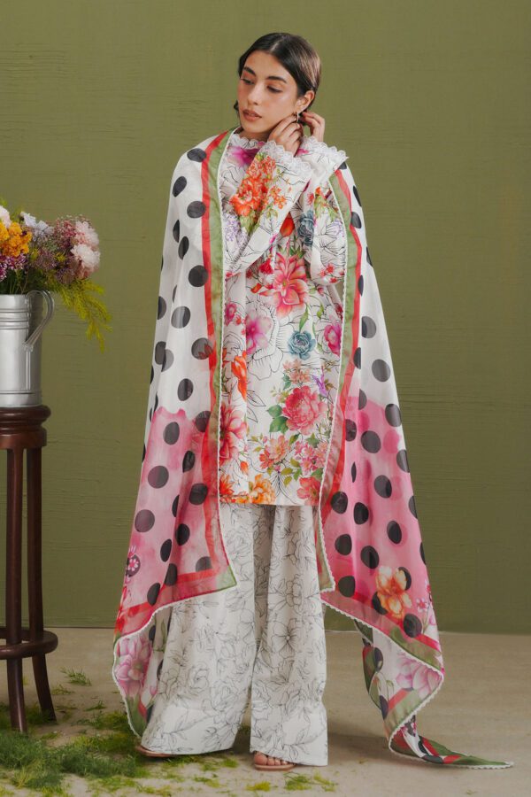 The dupatta is inspired by floral and polka dot elements. The shirt is printed in black and white with colorful floral accents. The trouser feature black and white floral prints to complete the set.