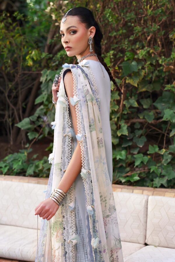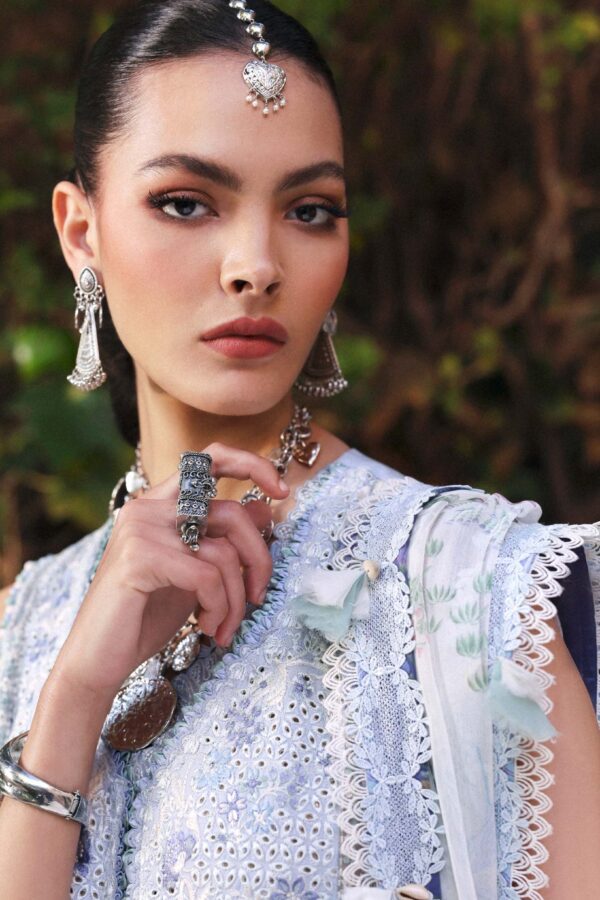 This front-open lawn shirt is fully embroidered with an allover boring pattern, kept light and breathable in a serene palette of whites, blues, and soft lilacs. Delicate floral motifs add a timeless elegance that feels perfect for day-long festivities. Finished with composed sleeves featuring a patterned organza border and a beautifully detailed organza hem, every element is designed to look refined yet effortless. Made for Eid moments, graceful, airy and meant to be worn from morning gatherings to evening celebrations.