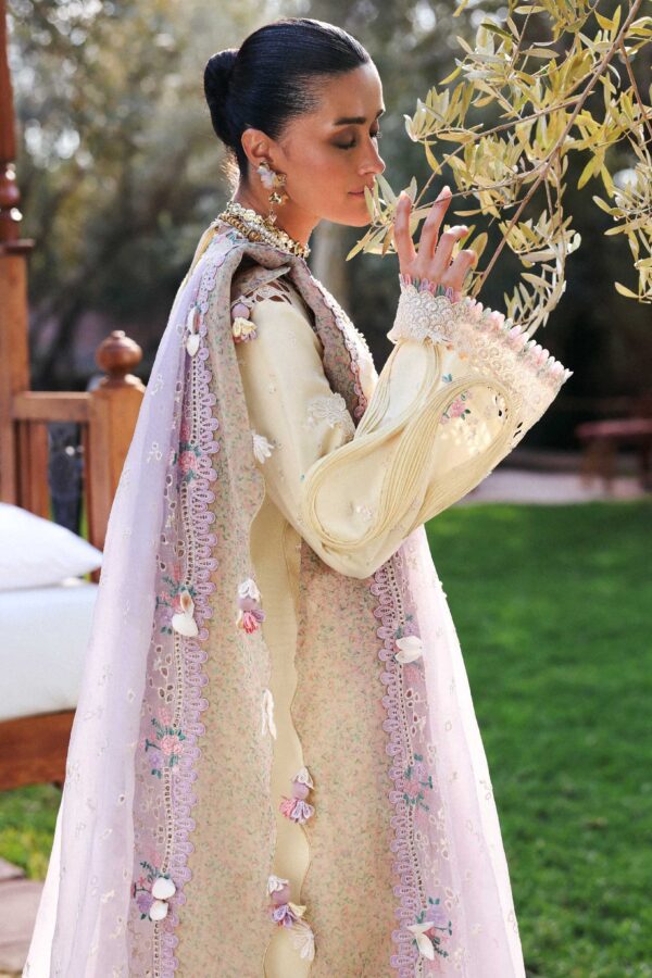 This butter-yellow three-panel shirt is a celebration of textile artistry, with bold laser-cut florals seamlessly paired with a composed digital print. Subtle Saru tree elements and botanical motifs in soft blossom pink, misty lilac, and moss green, balanced with cream accents, create a romantic, airy look. The sleeves are adorned with delicate floral sprays and appliquéd patches, finished with a structured organza border. Paired with a striking lilac organza dupatta featuring intricate eyelet details, architectural pallus, and a four-sided printed patti, the ensemble feels refined, graceful, and ready for festive celebrations.