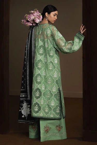Midoriya is crafted in sage green, adorned with bohemian floral, paisley, and jaali patterns brought to life through laser and hand embroidery. Paired with a black embroidered dupatta, detailed organza borders, and matching embroidered cambric trousers, the ensemble exudes a harmonious blend of sophistication, tradition, and understated luxury.