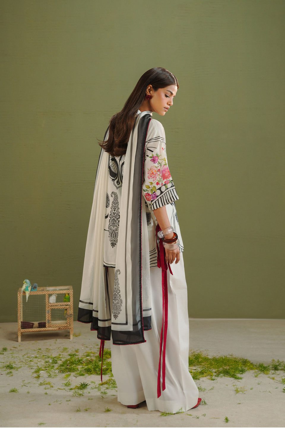 The dupatta is printed in black and white with paisley motifs and finished with a black border. The shirt features black and white art nouveau inspired prints. The trouser is detailed in black and white with a black border.