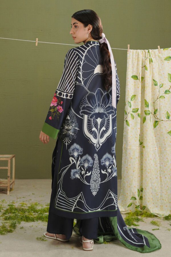 The dupatta is printed in midnight blue with paisley motifs and a moss green border. The shirt features midnight blue and white art nouveau inspired prints. The trouser is finished in solid midnight blue.
