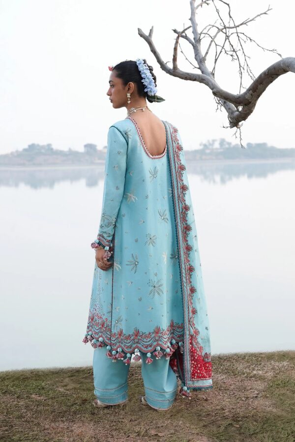 A breezy sky-blue summer ensemble exudes a soft, effortless elegance, artfully accented with a harmonious blend of red, blue, and off-white embroidered tones. The subtle interplay of colors creates a calm, mellow aesthetic while adding depth and visual charm. Completing the look is a lightweight sky-blue chiffon dupatta, enhanced with delicate red organza patching, lending the outfit a refined contrast and an airy, feminine finish—perfect for warm, sun-drenched days.