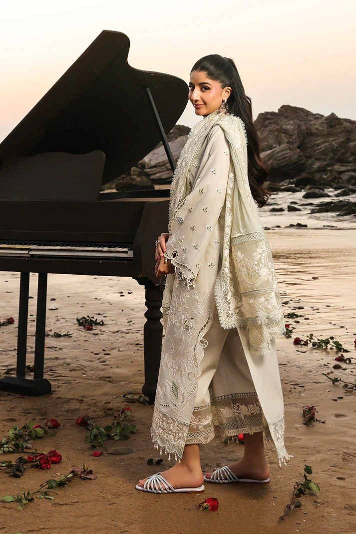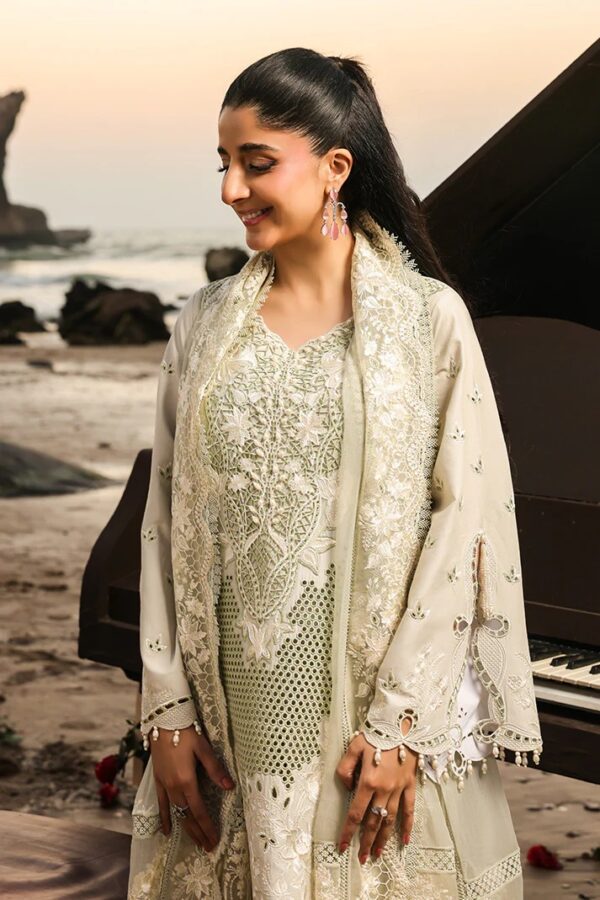 Graceful and refined, this pearl ivory embroidered lawn dress is a timeless addition to any summer wardrobe. The embroidered lawn shirt features delicate detailing across the front and sleeves, enhanced with elegant organza borders and neckline embellishments. Paired with a lightweight chiffon dupatta, this ivory luxury lawn suit offers soft movement and understated elegance. The breathable cotton trouser ensures comfort without compromising on style. Perfect for festive daytime wear, summer gatherings, and elegant casual occasions, this Pakistani designer ivory lawn outfit embodies classic femininity with premium craftsmanship.