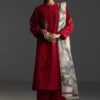 A stone white embroidered shirt with modern laces and chikankari details, paired with an embroidered trouser, and finished with a printed burnt red dupatta for a soft, elegant finish.