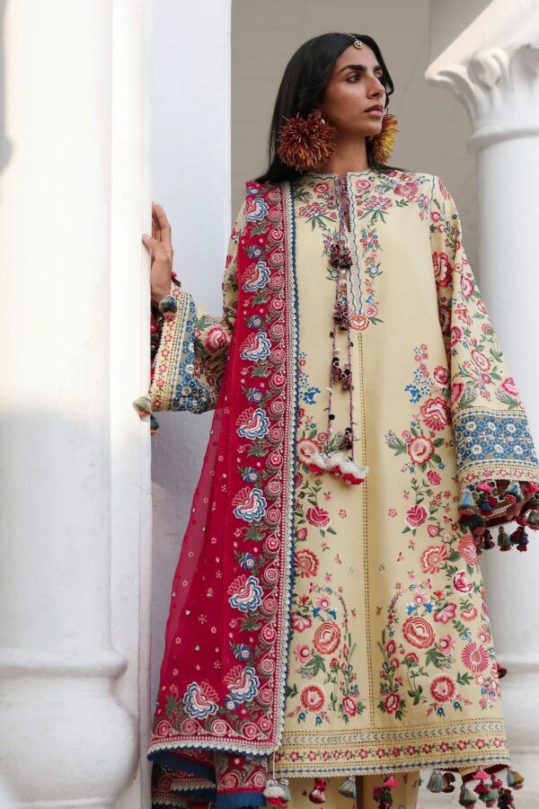 A radiant butter-yellow ensemble comes alive with a playful blend of summery hues, showcased through intricate multicolored embroidery. The lively detailing adds depth and character, creating a fresh and joyful aesthetic. Paired with a striking fuchsia pink chiffon dupatta, finished with a beautifully embroidered four-sided border in complementary colors, this ensemble makes a bold yet elegant statement—perfect for bright summer days and festive gatherings.