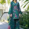 ZURI is a stunning ensemble featuring a printed lawn front adorned with delicate Chikankari embroidery and an intricately embroidered neckline. The embroidered shirt front and sleeve borders add elegant detail, while printed lawn sleeves and back create a harmonious design. Paired with dyed cotton trousers and a soft chiffon printed dupatta, this outfit exudes timeless charm and sophistication.